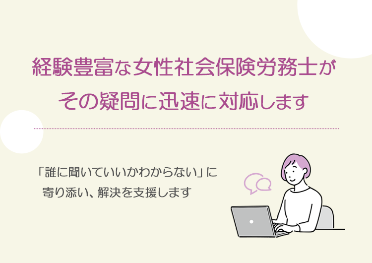 経験豊富な女性社会保険労務⼠がその疑問に迅速に対応します。