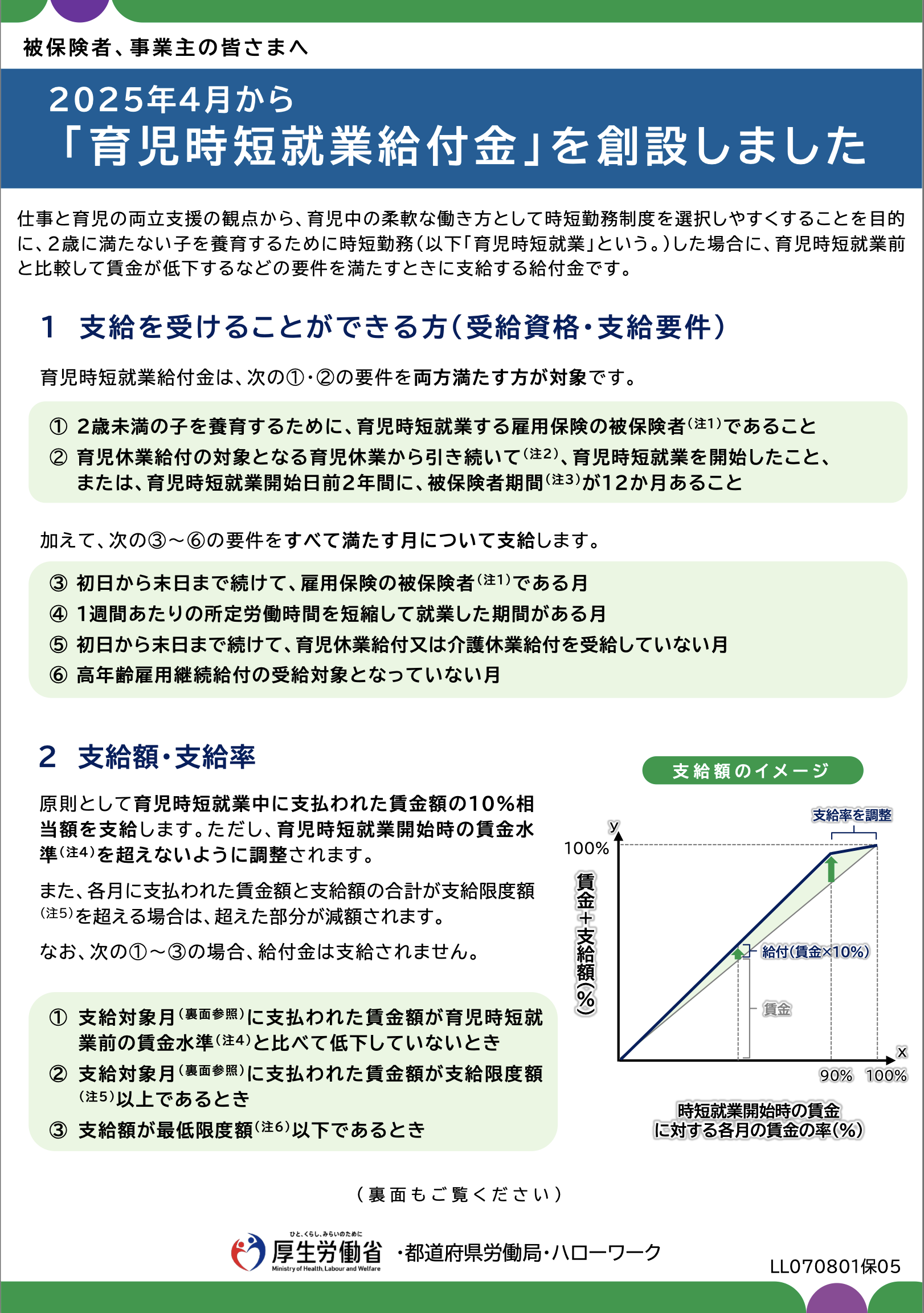 一定の要件を満たした方が時短勤務で職場復帰し、育児時短就業前と比較して賃金が低下するなどの要件を満たすときに支給される給付金です。